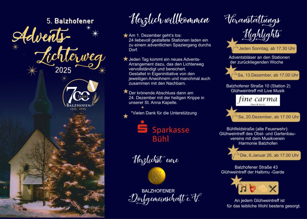 Am 1. Dezember ist es wieder soweit: Unser Lichterweg-Adventskalender startet nun schon zum 5. Mal und verspricht wieder stimmungsvolle Abendspaziergänge durchs Dorf mit netten Begegnungen und freudigen Momenten für alle Sinne. Wie immer startet der Weg mit der Nummer 1 beim BalzHOFenshop. Der Rundweg durch das Dorf wird jeden Tag um ein neues Arrangement ergänzt. Wegweiser entlang des Weges werden Nicht-Ortskundigen das Finden des RundParcours erleichtern. Zusätzlich liegen an Station 1 Flyer aus und auf Balzhofen.com steht der Plan zum Download bereit. Zudem gibt es den Plan des Rundweges auf google-maps und auf Komoot. Die QR-Codes sind diesem Bericht beigefügt.